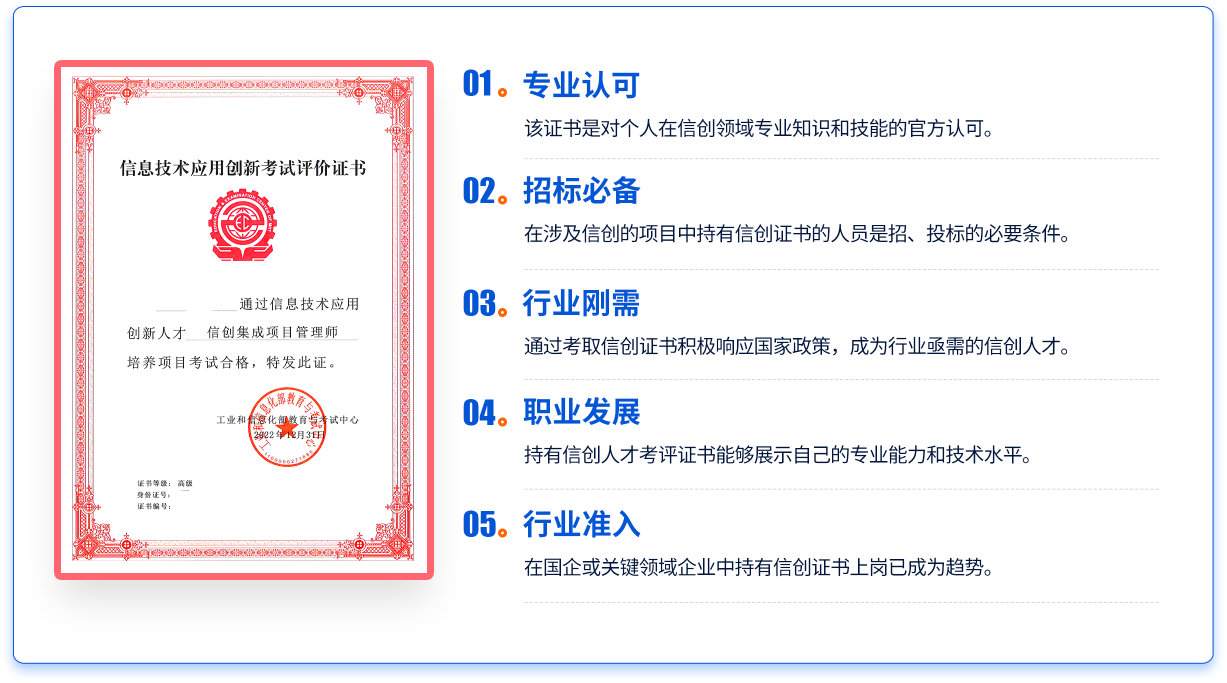 通过本考试的合格人员能够依据有关法律、法规、政策和标准,结合业务应用领域和信创技术发展情况,管理具有商业价值的项目交付;了解信创产业主流厂商的产品特征;掌握与项目管理特定领域相关的知识和技能;能够指导、激励和带领团队实若试现具有商业价值的项目交付。