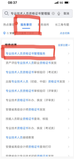 第三步:搜索服务事项“专业技术人员资格证书管理服务”。
