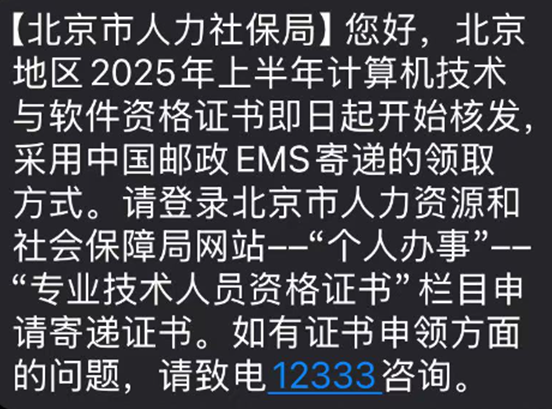 北京2025上半年软考证书邮寄申领开始短信文字版: