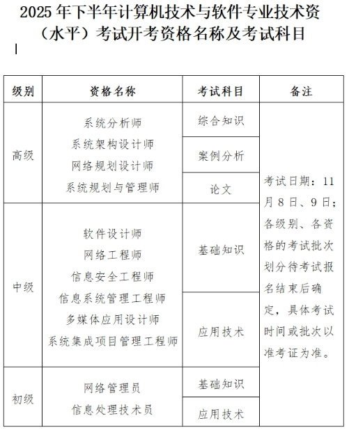 附件:2025年下半年计算机技术与软件专业技术资格(水平)考试开考资格名称及考试科目(点击查看)