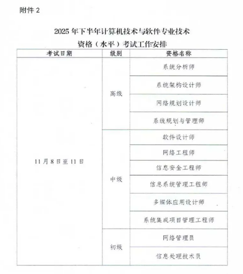 根据全国计算机专业技术资格考试办公室《关于2025年度计算机技术与软件专业技术资格(水平)考试工作安排及有关事项的通知》(计考办(2025)1号)的有关要求,现将2025年下半年计算机技术与软件专业技术资格(水平)考试工作通知如下: