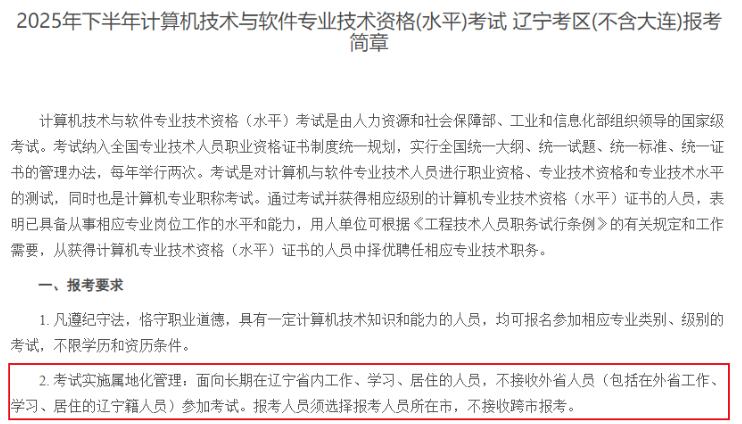 报名通知里明确表示,只面向长期在辽宁省内工作、学习、居住的人员,不接收外省人员(包括在外省工作、学习、居住的辽宁籍人员)参加考试。