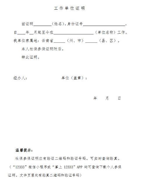 2.实际工作地在单独划线地区的工作单位证明(必须包括姓名、身份证号、工作单位及工作所在地地址等,样表在附件下载)、本人在单独划线地区社保参保证明(加盖单位公章)。社保参保证明应有验证二维码和验证号码,可实时查询验真。(“12333”微信小程序或“掌上12333”APP均可查询下载个人参保证明,文件页眉处有验真二维码和验证号码)