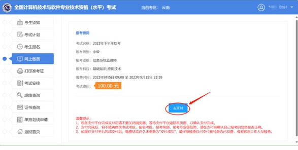 1、报名审核通过后,点击左侧“网上缴费”,进入缴费界面,核对报名信息无误后,点击“去支付”: