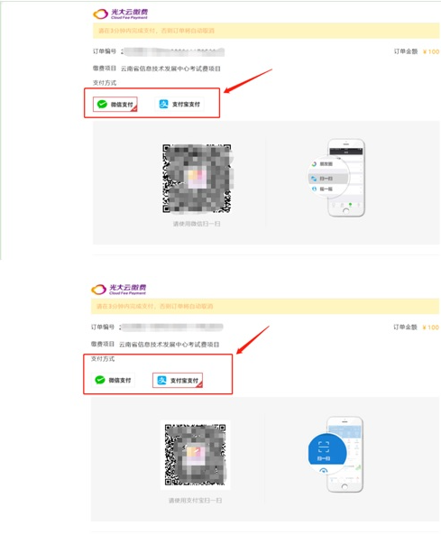 3、进入光大云缴费界面,选择“微信支付”或“支付宝支付”,扫码支付: