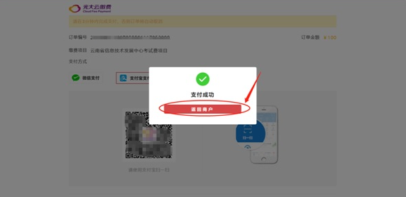 4、支付成功,会出现“支付成功”提示,点击“返回商户”回到报名系统。