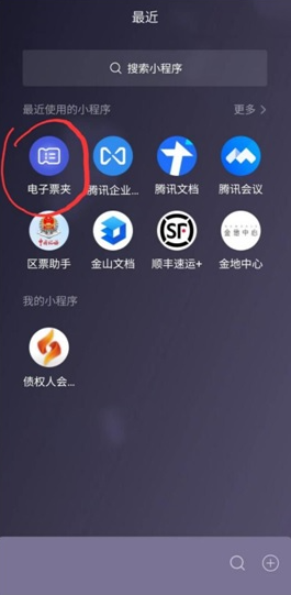 2、注册之后,点小程序中间的“票夹”按钮,就可以查看和下载已经开出的电子票: