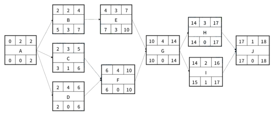 方法二:画单代号网络图,画出图形后一看便知,关于如何画图及步骤在案例专题视频课中有详细的讲解。先根据题干表画下面的单代号网络图,清楚各活动之间的相对位置: