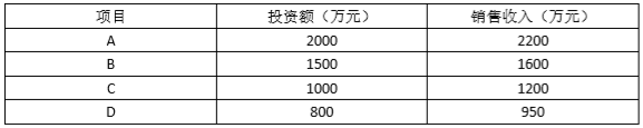 31、下表列出A、B、C、D四个项目的投资额及销售收入,根据投资回报率评估,应该选择投资()。