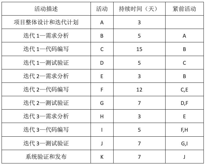 31、32、一个软件研发项目使用迭代开发,共计进行3次迭代,每次迭代的工作分解均为:需求分析-设计编码-测试验证。该项目的活动关系表如下: